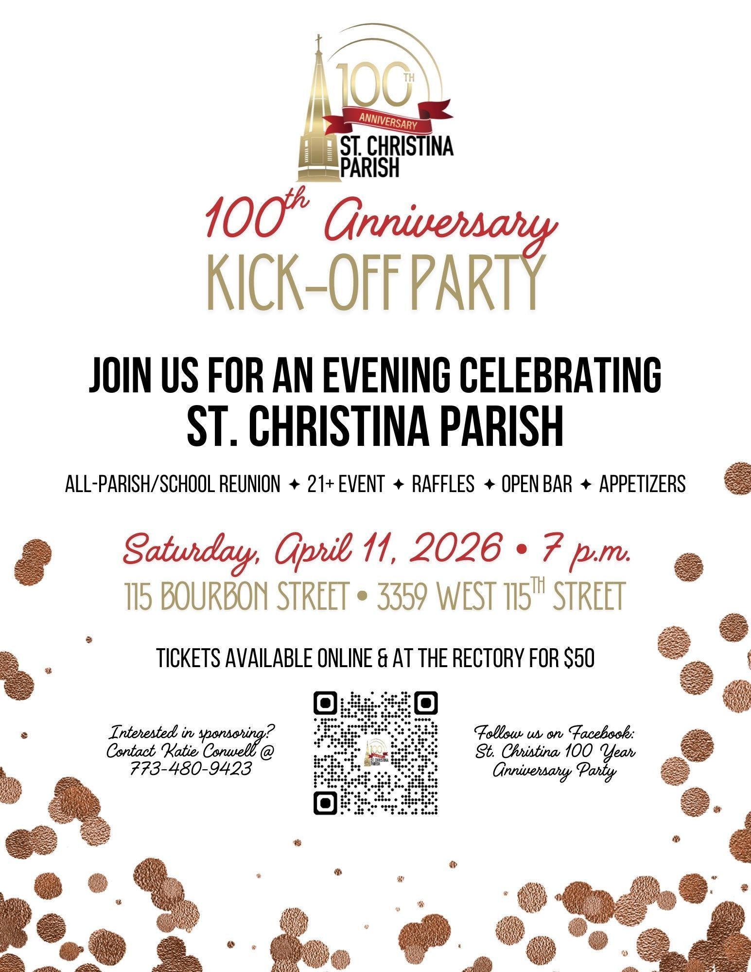As a Parish, we will be celebrating our 100th Anniversary in April 2026. Many parishioners remember the 75th Anniversary celebrations and we've been planning a similar year of events and opportunities to grow closer to God. These celebrations all start at the Kick-Off Party on April 11, 2026. We'll have an All-Parish Reunion Mass at 4:00 p.m. followed by the event at 115 Bourbon Street starting at 7:00 p.m.
