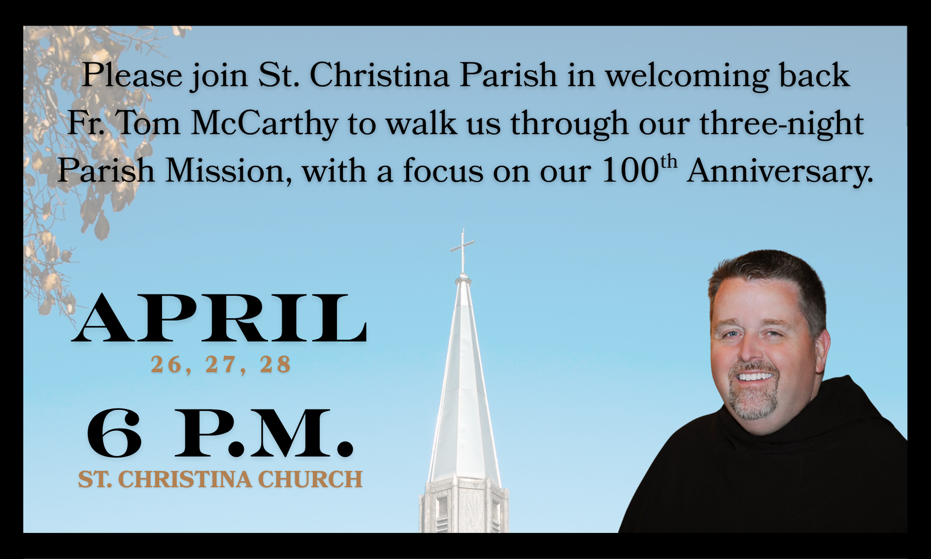 Nuns4Fun will visit St. Christina on the night of February 20, 2027. It's sure to be a hilarious night, encompassed around a meaningful message. Keep an eye on this page as updates become available.