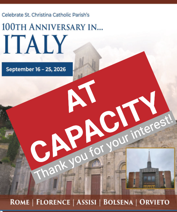 To celebrate our parish 100th Anniversary, I’d like to invite you on a great adventure. Let’s make a pilgrimage to Assisi, Florence, Rome, and Bolsena - the hometown of St. Christina. Come and find yourself face-to-face with the living story of our Catholic Church. Pray and shout for joy at an audience with our very own Pope Leo XIV. Grow closer to St. Christina as we visit her grave and hometown.