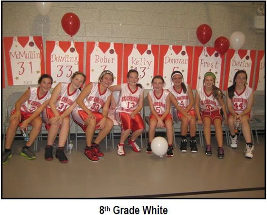 The 8th grade white girls basketball team completed their season with a 25-13 record, reaching the Final Four in both the SSBL West division and Southside Catholic White division. The team won the Mt. Assisi Shootout Championship led by Emily Frost and Erin Donovan, who earned all tournament awards. Over the past 3 years the team has won over 80 games and brought home 2 championships, 1 runner-up, and 5 final four appearances!! Congrats on another successful season! Members of the team are: Erin Kelly, Sara Dowling, Erin Donovan, Erin Larkin, Catherine McMullin, Emily Bober, Emily Frost, Mary Dillon, and Mary Devine. The team was coached by Tony Kelly and Rich Dowling.