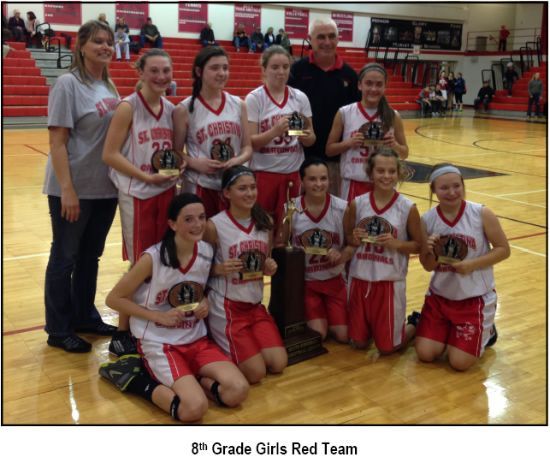 Congratulations are in order for the 8th grade girls red basketball team for a championship in the South Suburban Basketball League. They also won the Mt. Assisi Shootout championship and were runners up in the South Side Catholic Conference championship. They completed the season with an overall record of 33 wins and 8 losses. Team members are Amber Andersen, Claire Austin, Jacinda Brija, Ashley Bryja, Sara Bryja, Tori Carroll, Mary Rose Cleary, Taylor Kelly, and Athina Zoller. The team was coached by Mike Austin and Mary Carroll. Way to go girls!