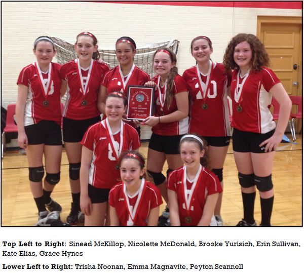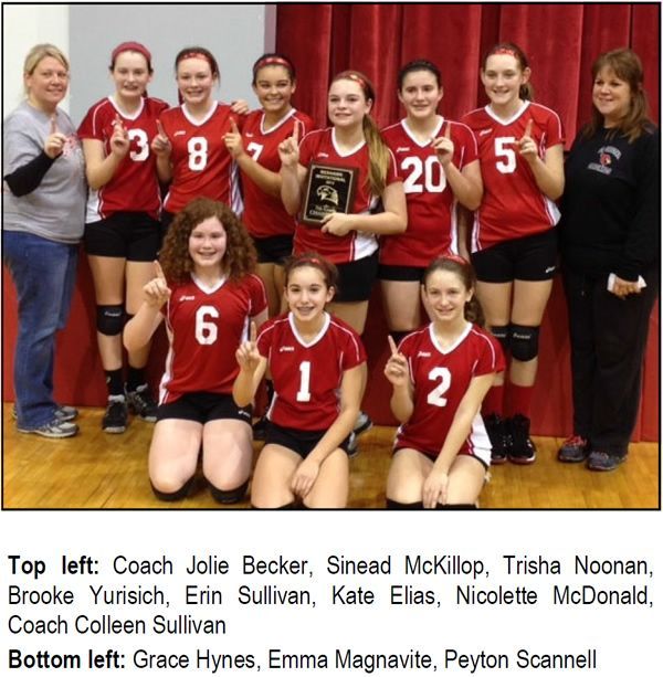 The 8th graders were: Rose Bingham, Kaithlyn Maloney, Colleen Reilly, Kevin Griffith, Zack Johnson, Sean Kilroy, Chris McMahon, Matt Pikowski, Pat Reilly, and captains Samantha Kirby, Kristen Roszak, Sean Rio and Joe Kezon. The 7th graders were: Claire Collevy, Maggie Hackett, Jessica Wawrzyniak, Tim Adent, Mike Gallapo, Mike Gardner, and Conor Sullivan. The team was coached by Joe Kezon and Jason Witt.