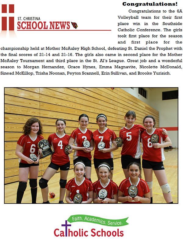 Congratulations to the St. Christina 7th Grade Volleyball team on their Championship Win in the Mother McAuley Volleyball Tournament. The girls were undefeated for the tournament. Way to go Cardinals!