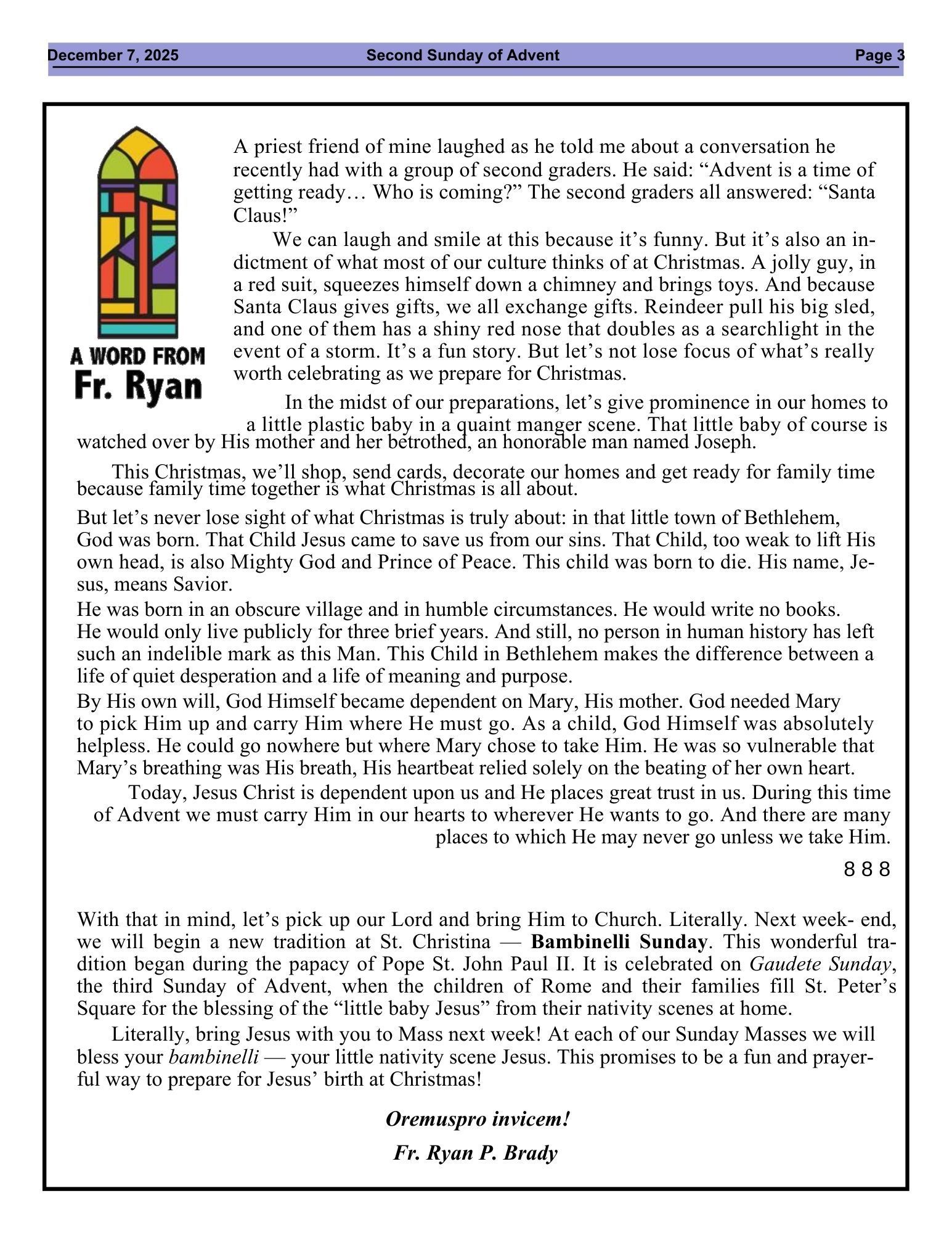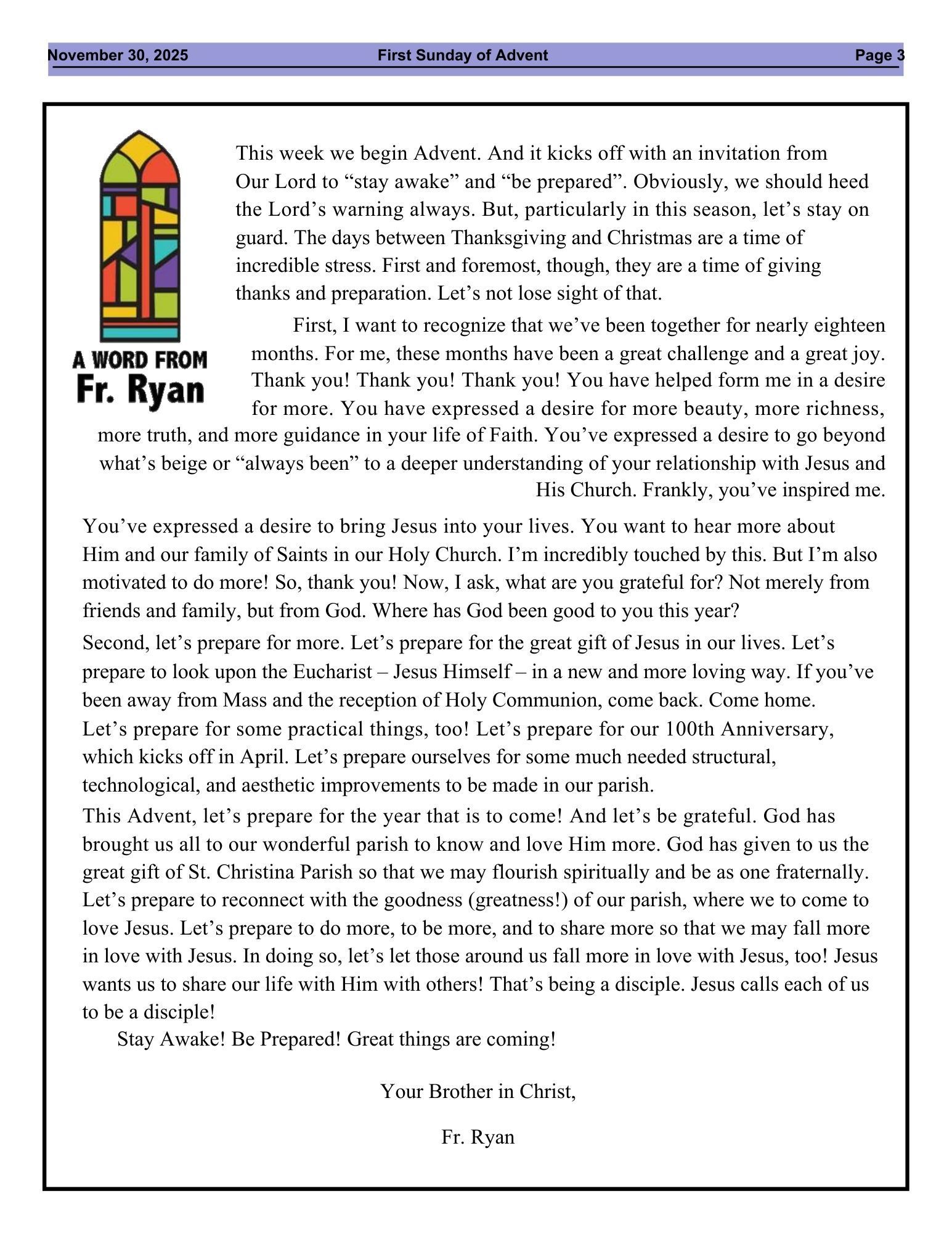 St. Christina Catholic Parish is a Catholic community of faith called to be God’s Holy People. Continually formed and fed by Our Lord in Word and Sacrament, together we strive to love and serve, invite and unite, support and challenge one another to joyfully live and proclaim the Gospel of Jesus Christ.
