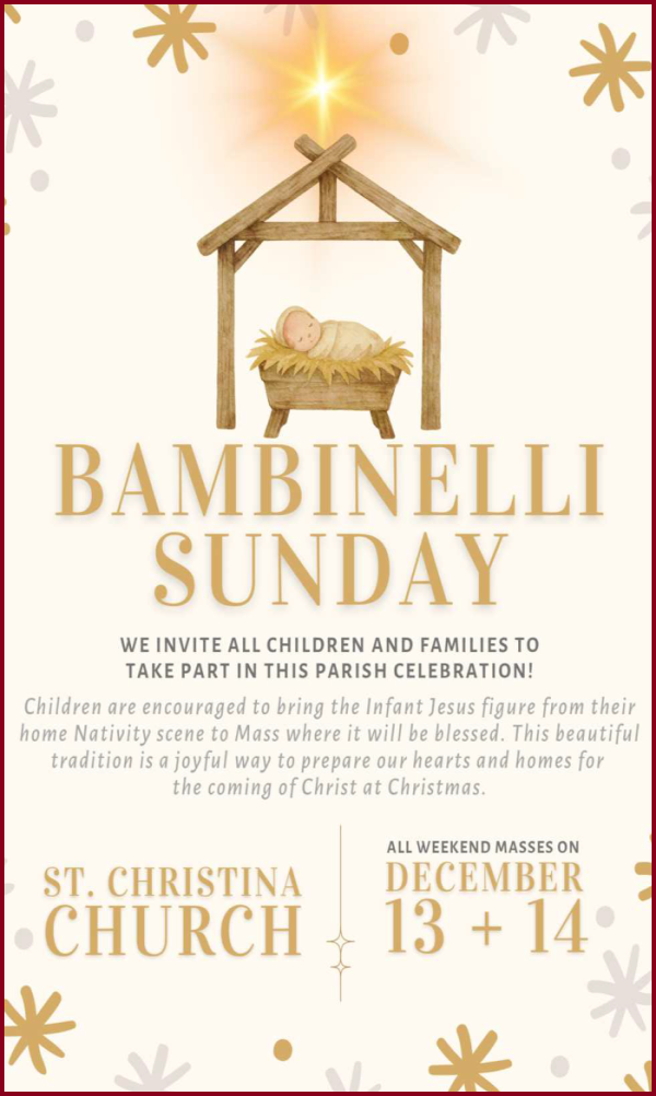 Bambinelli Sunday is a tradition in Italy for families to bring their Infant Jesus figure from their home Nativity scene to Mass on the Third Sunday of Advent. Fr. Ryan has brought this tradition all the way to Mt. Greenwood! The Sunday Masses of December 13 & 14, 2025 were an absolute blast!